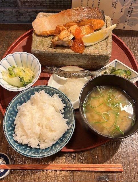 弾力のある鮭に土鍋で炊き上げたご飯・味噌汁全部が美味しい😋